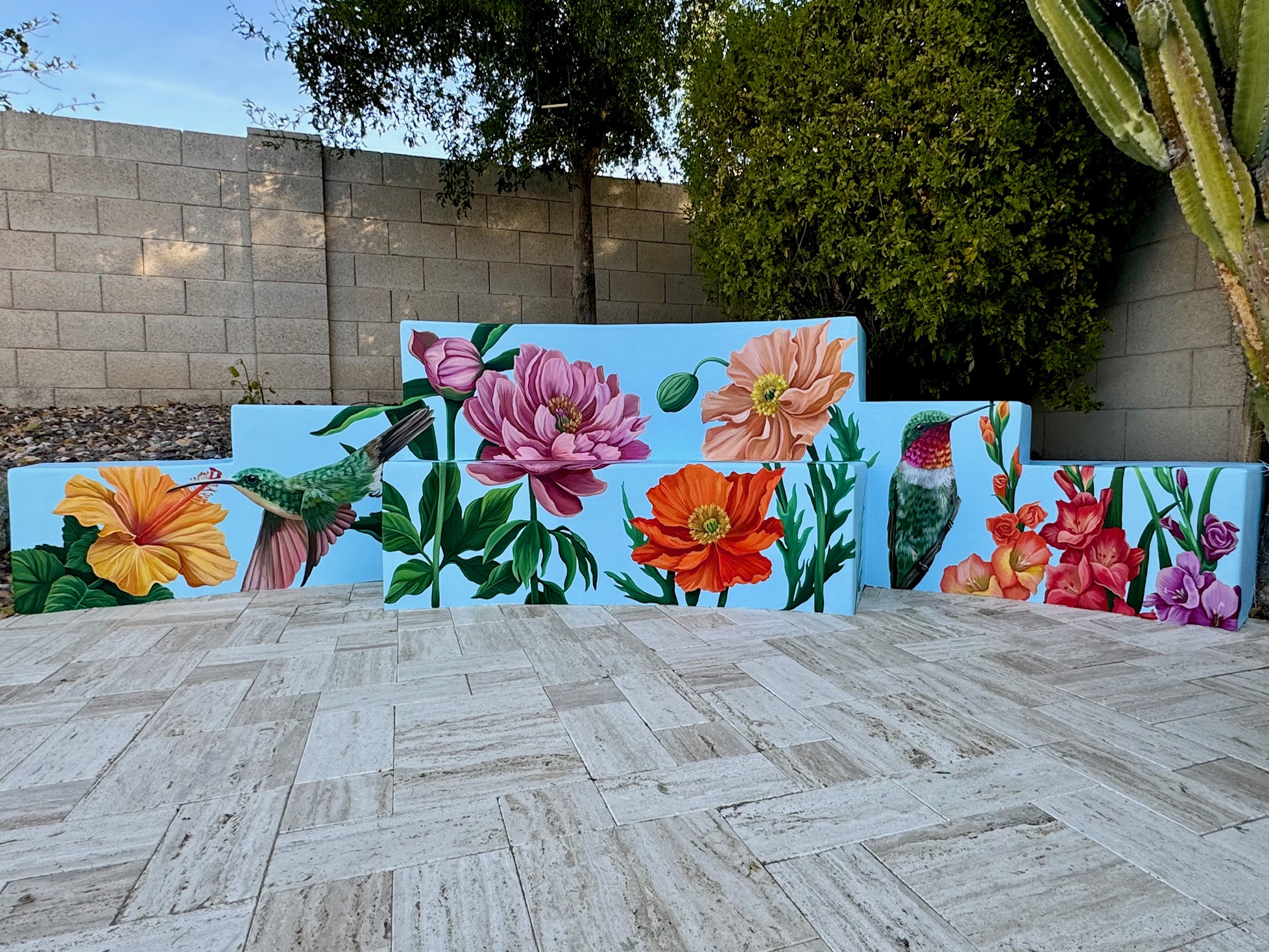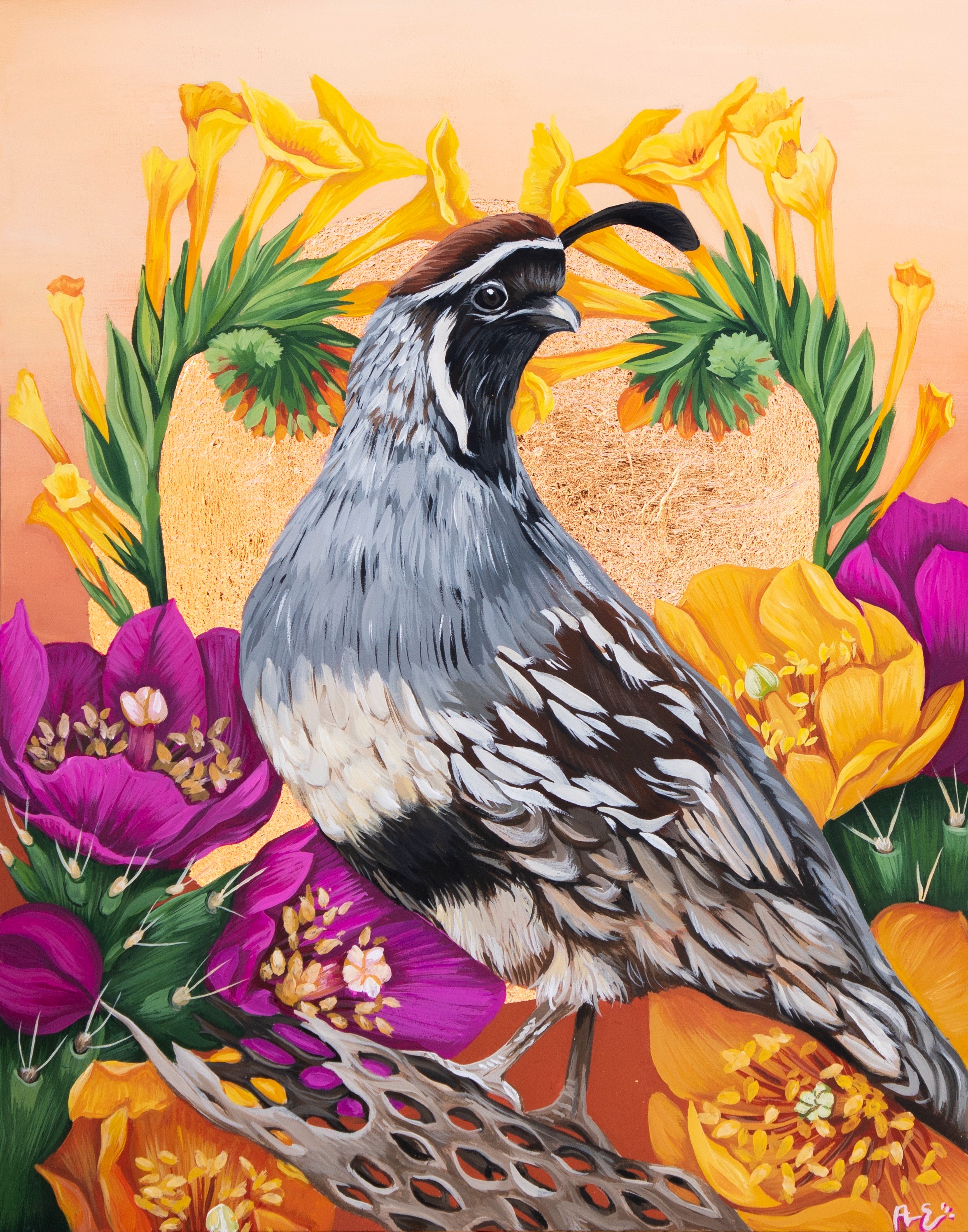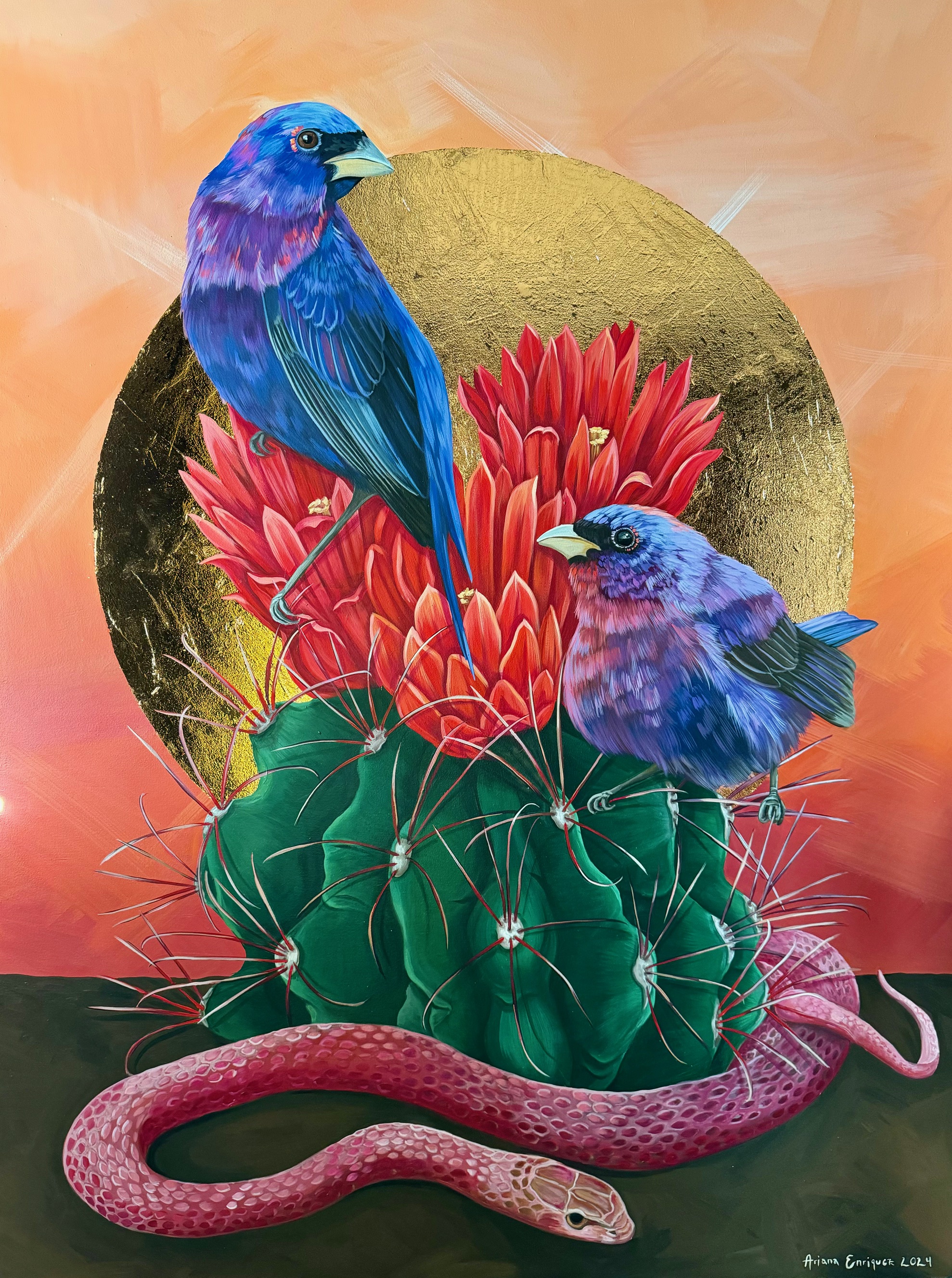 Ariana Enriquez (b. El Paso, Texas) is a visual artist based out of Mesa, Arizona. She received her BFA in painting and MA in art history from Arizona State University. After working in art museums for a decade, Enriquez started her own mural business in 2022. Finding meditative and self-healing qualities in the outdoors, Arizona’s natural landscape serves as Enriquez’s largest source of inspiration. The botanical and ornithological subject matter portrayed in her work are reflections of her experiences, metaphors of her family and extensions of her identity. Enriquez primarily works with acrylics in her studio and mural practice. Her clients have included Tostitos, Shane Company, Desert Botanical Garden and South Phoenix’s beloved flower shop, Baseline Flowers. Seeking to honor the nuances of nature’s details, Enriquez hand paints every aspect of her work. She hopes to show how beauty can be found in the small things that surround us.