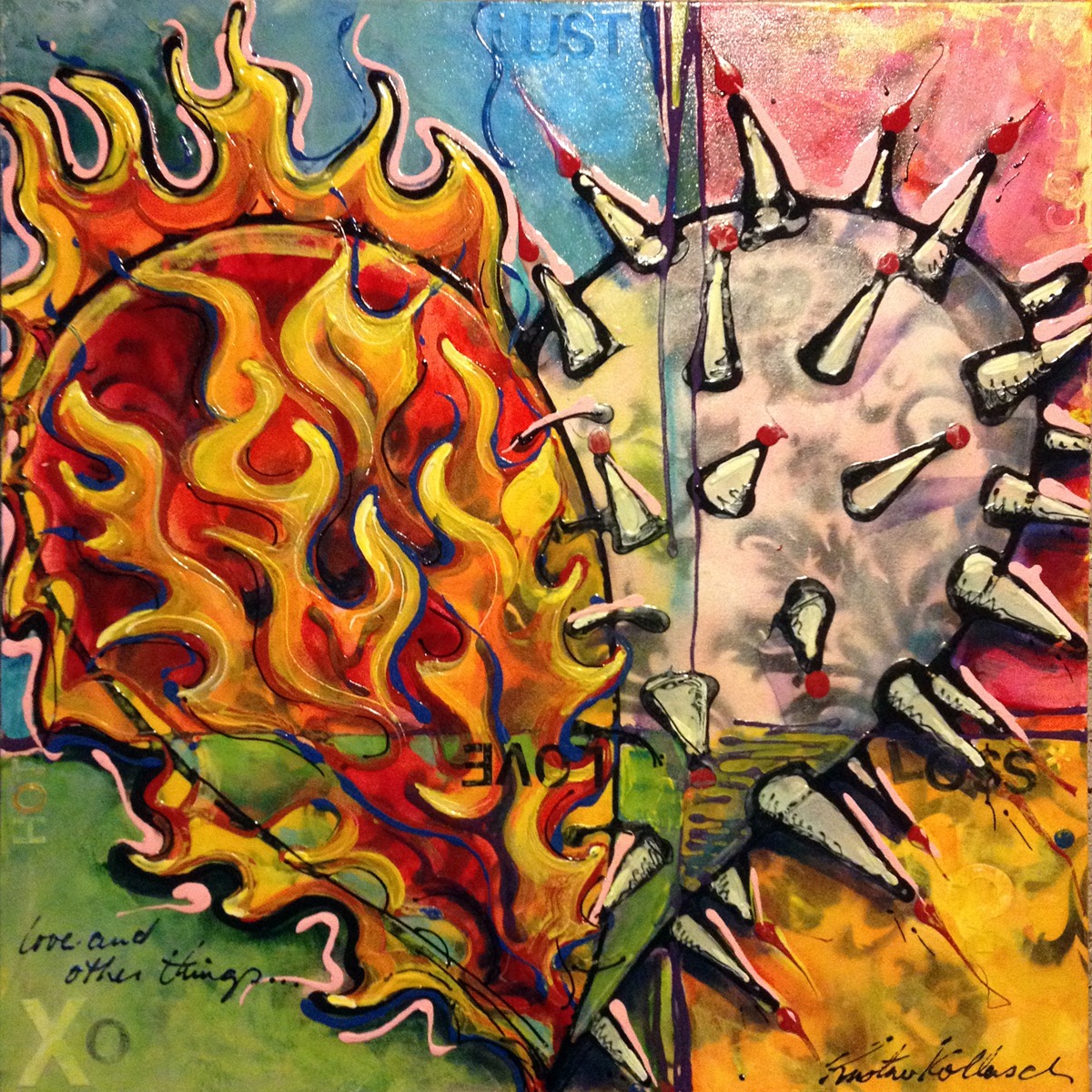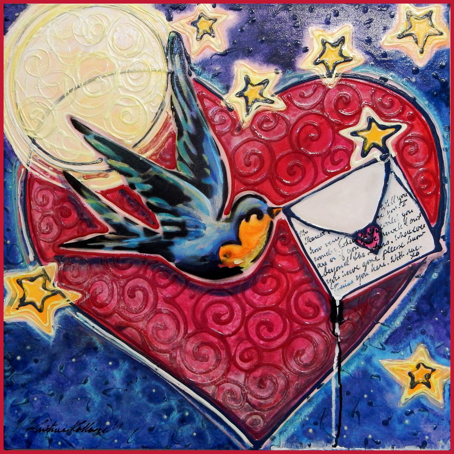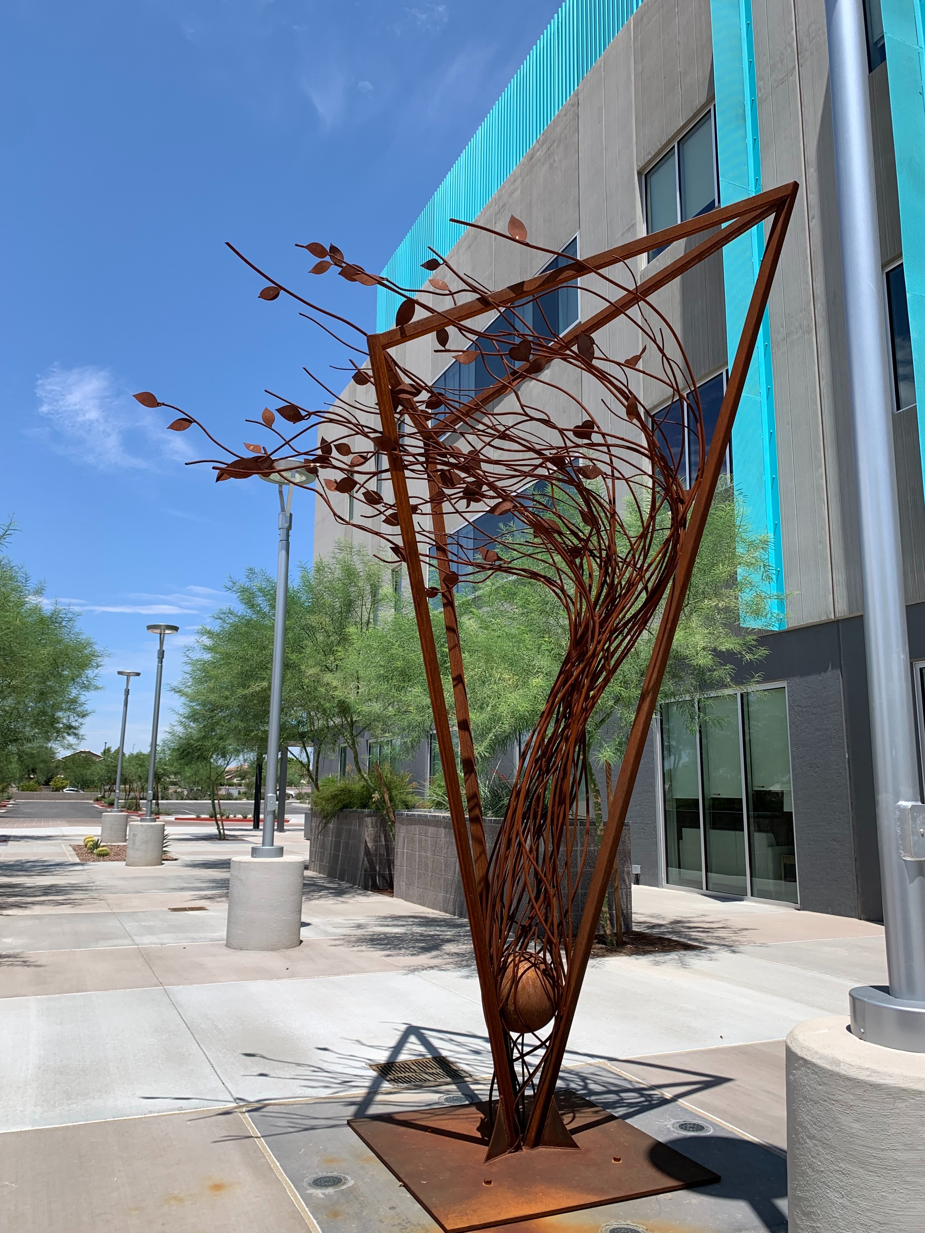 Kristine Kollasch’s artwork does not fit into one category. She is a painter and a sculptor, a designer and builder. Her studio art ranges from mixed media assemblages to ethereal landscapes in acrylics that are made with layers of color, textured with the impressions of leaves and twigs. There are small whimsical ceramic sculptures and monumental contemporary steel sculptures. You will find several styles and expressions in her studio, each technique and style backed up with a significant body of work. And as different as her works can be, they do relate to one another, with similarities and subtleties of color or composition, or with love and humor and a joy that can be seen and felt throughout Kris’s work. Kris moved to the Phoenix area in 1995 with a degree in art education from Adams State College, in Alamosa, Co. But instead of getting a job in education she landed a job Habitat, Inc, a design/build firm in Tempe, AZ from 1985-1996. There she built architectural and topographical scale models and grew to manage the 3D department that encompassed model building, signage fabrication and 3D displays. This experience and the connections made there allowed her to start her own business in 1996. Her company, Fine Art & Creative Environments, LLC. that umbrellas her work in Fine Art, Murals & Themed Environments, and Public Art has impacted the southwest far beyond the Kollasch studio. Many hospitals, medical facilities, parks, restaurants, and residences have become brighter spots through the work of Kris and her team. She has also impacted the arts in AZ through her involvement with Free Arts for Abused Children of AZ, with GLSEN Phoenix, as a mentor, teacher and advocate. As the lead curator at the First Studio Gallery in downtown Phoenix since 2012, Kris has coordinated and curated over 65 shows there, featuring hundreds of local and regional artists. To find out more about Kris Kollasch, follow her on FB at Fine Art & Creative Environments, LLC or IG @Art_And_Environments. www.ArtAndEnvironments.com