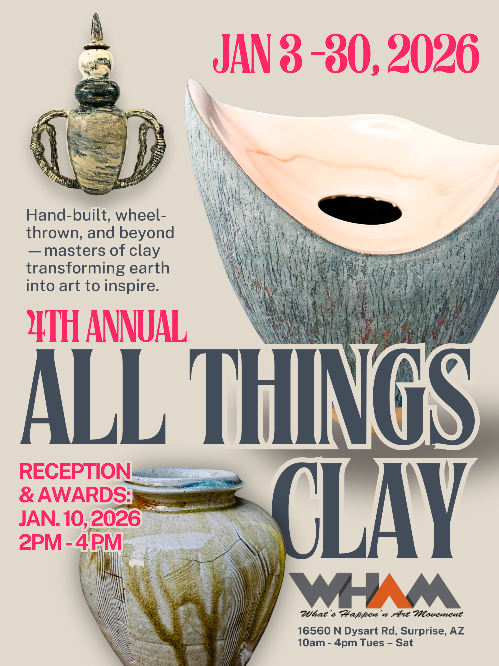 Join us at WHAM Art Center for a celebration of ceramic art! From January 3–30, 2026, explore hand-built, wheel-thrown, and sculptural works—masters of clay transforming earth into art to inspire.
