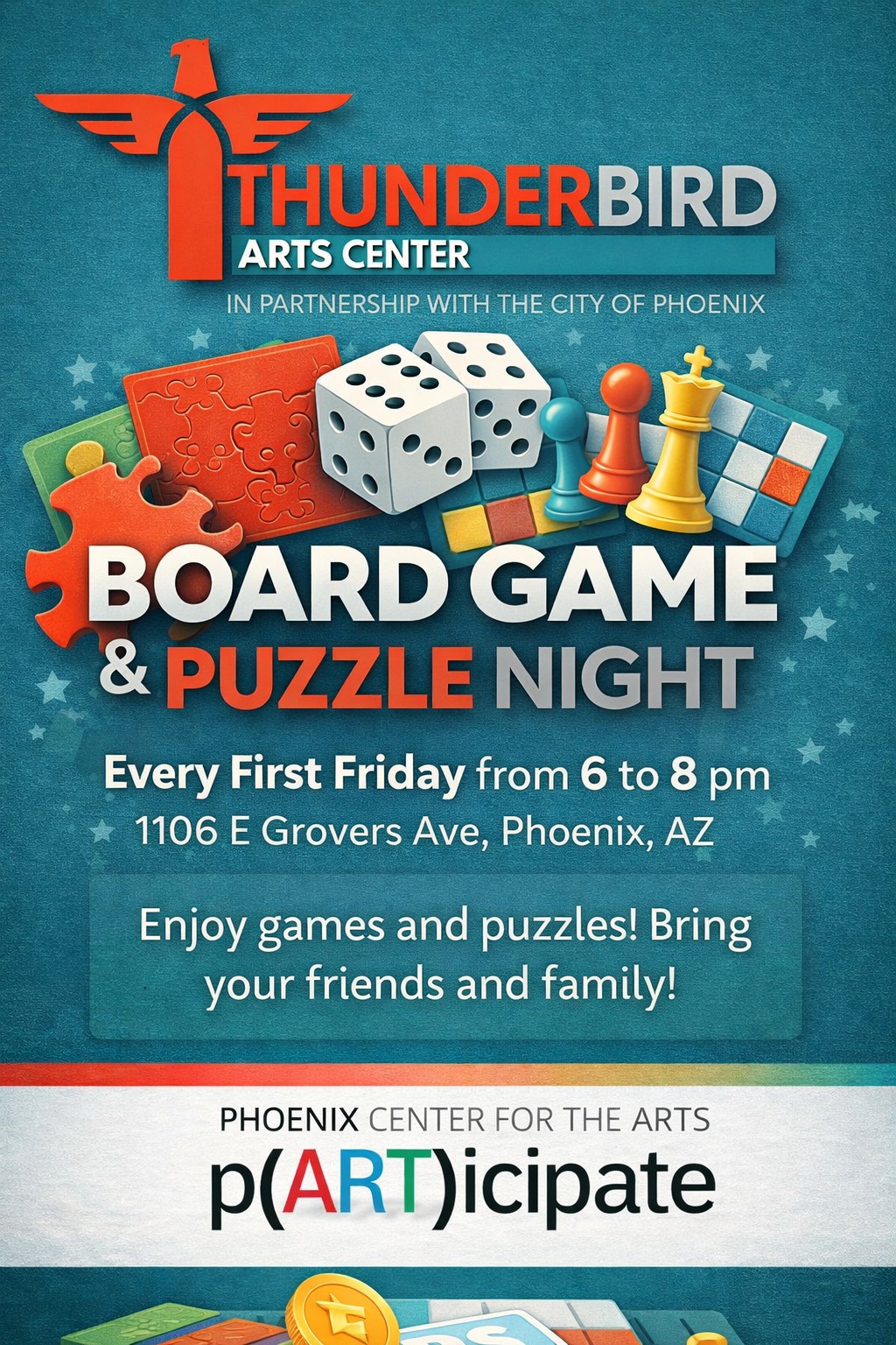 Kick off your weekend with community, creativity, and a little friendly competition! Join us Every First Friday from 6–8 PM for Board Game & Puzzle Night at Thunderbird Arts Center.