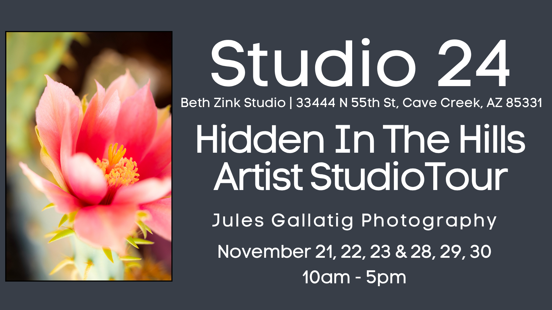Visit Studio 24 – Beth Zink Art during the 29th Annual Hidden in the Hills Artist Studio Tour, November 21–23 and 28–30 from 10am to 5pm. Presented by the Sonoran Arts League, this free, self-guided tour invites you to explore the studios of talented local artists throughout the scenic Desert Foothills communities of Cave Creek, Carefree, and North Scottsdale. Jules Gallatig Photography is proud to be a guest artist at Studio 24, showcasing vivid desert and botanical imagery printed on stunning metal and pearl canvas. At Studio 24, you’ll experience art in a welcoming setting where you can meet the artists, learn about their creative process, and purchase original works directly from them—a perfect opportunity for collectors, art lovers, and holiday shoppers to discover unique, high-quality art in an inspiring desert setting. To learn more about the tour visit: www.HiddenInTheHills.com