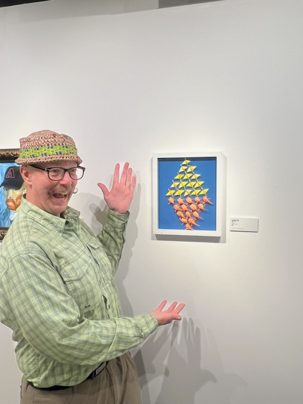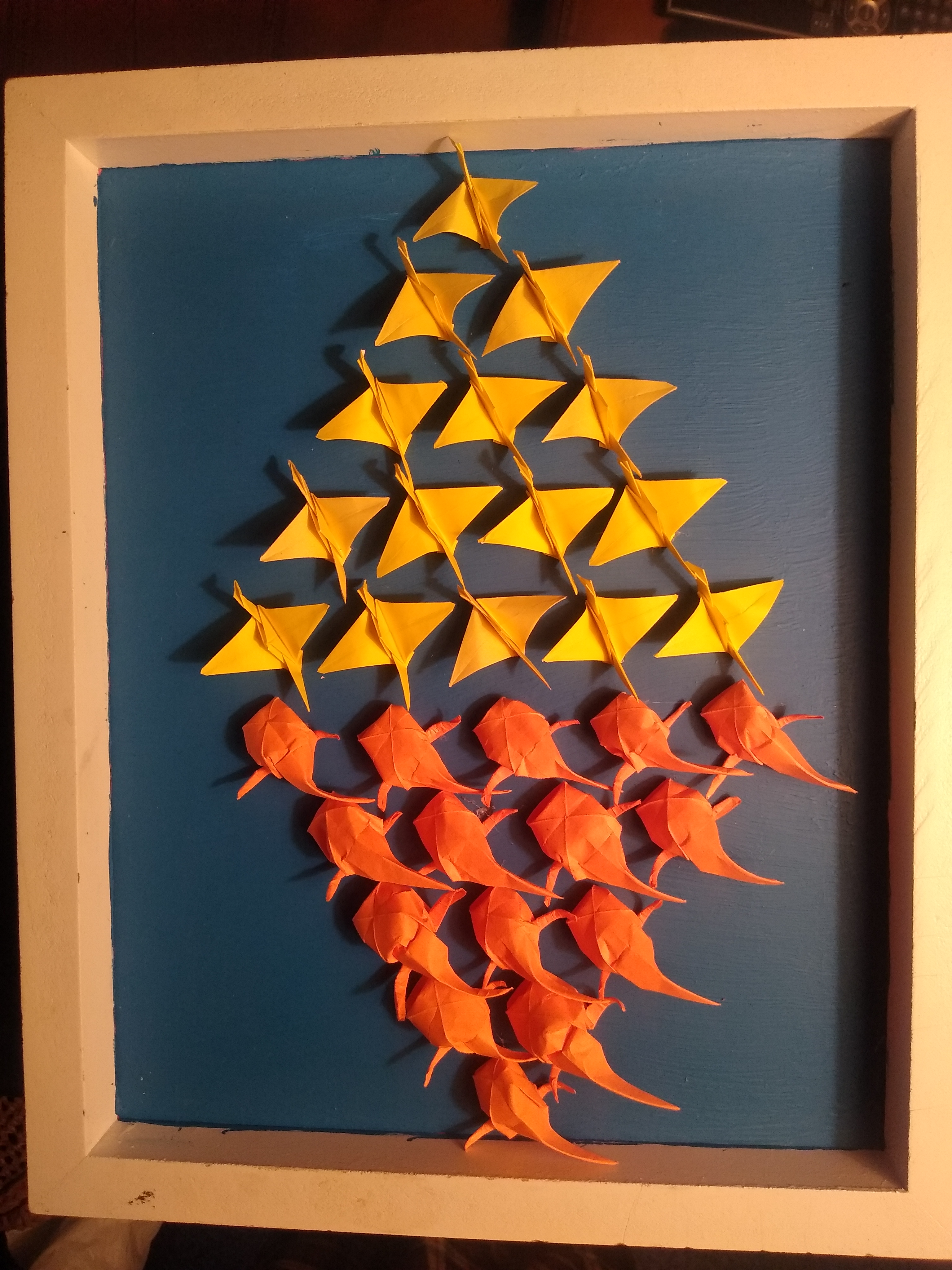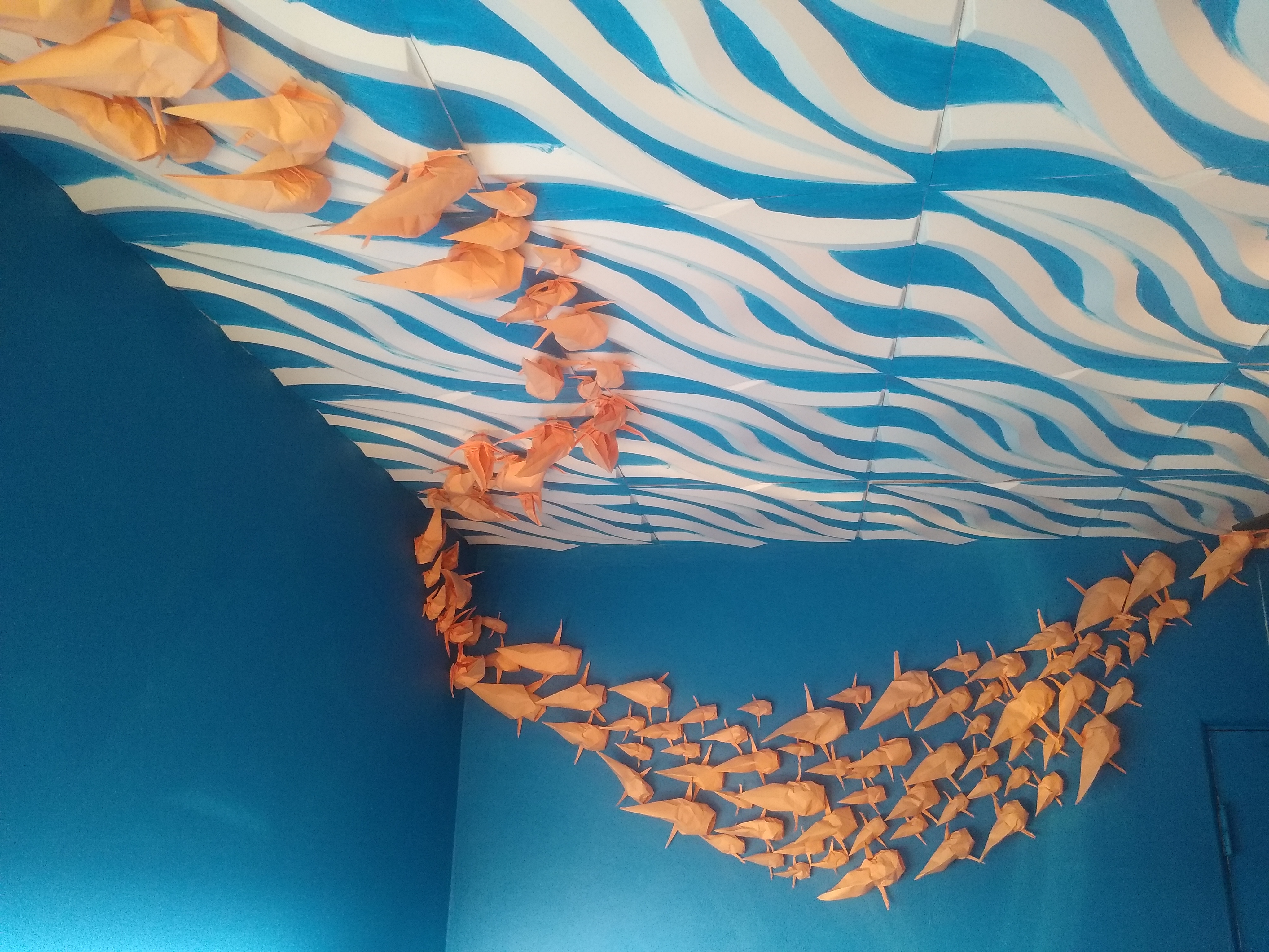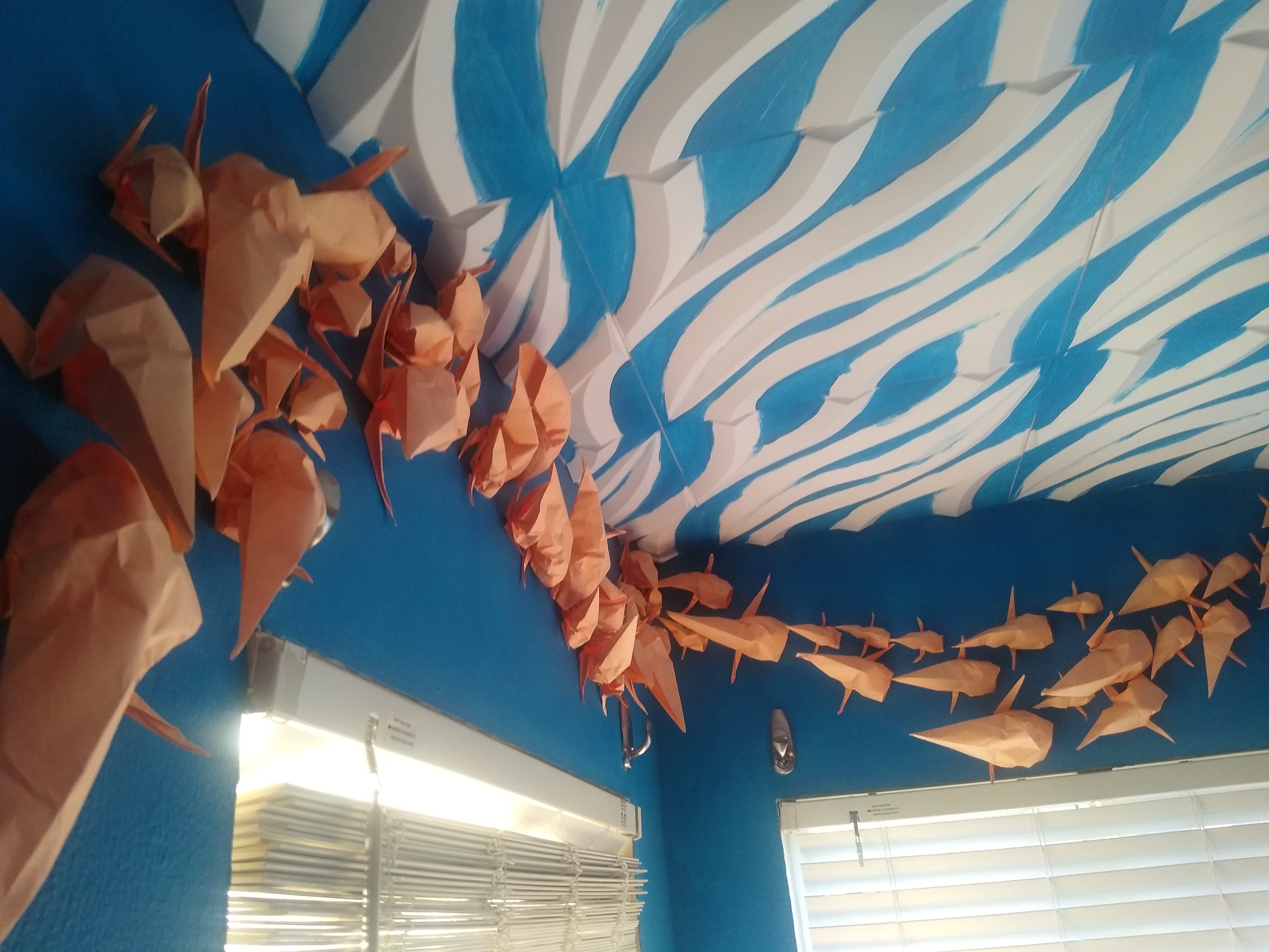 I create hundreds of origami koi to swim in a school around any space. I also make smaller versions in shadow boxes of the large installations.