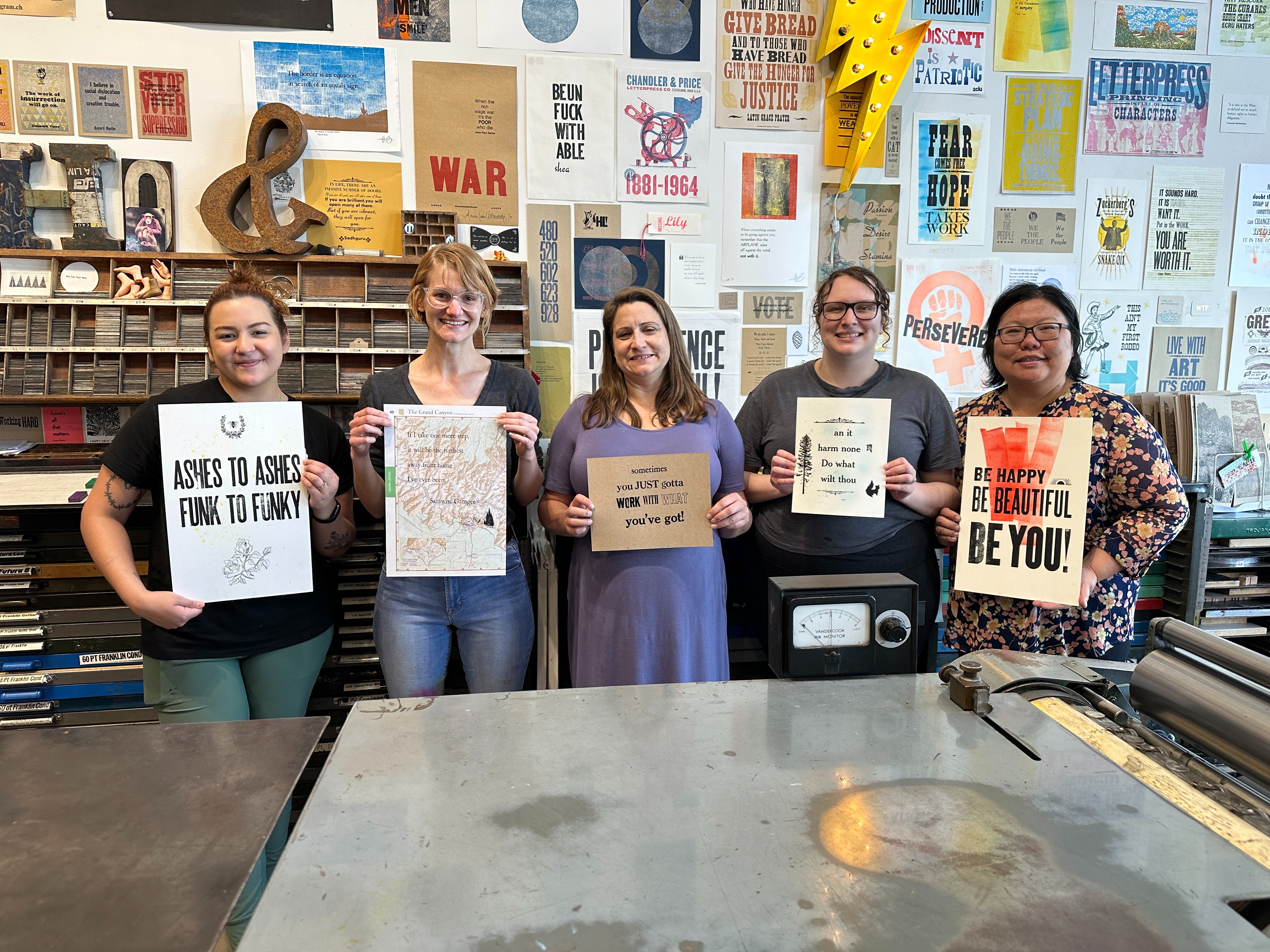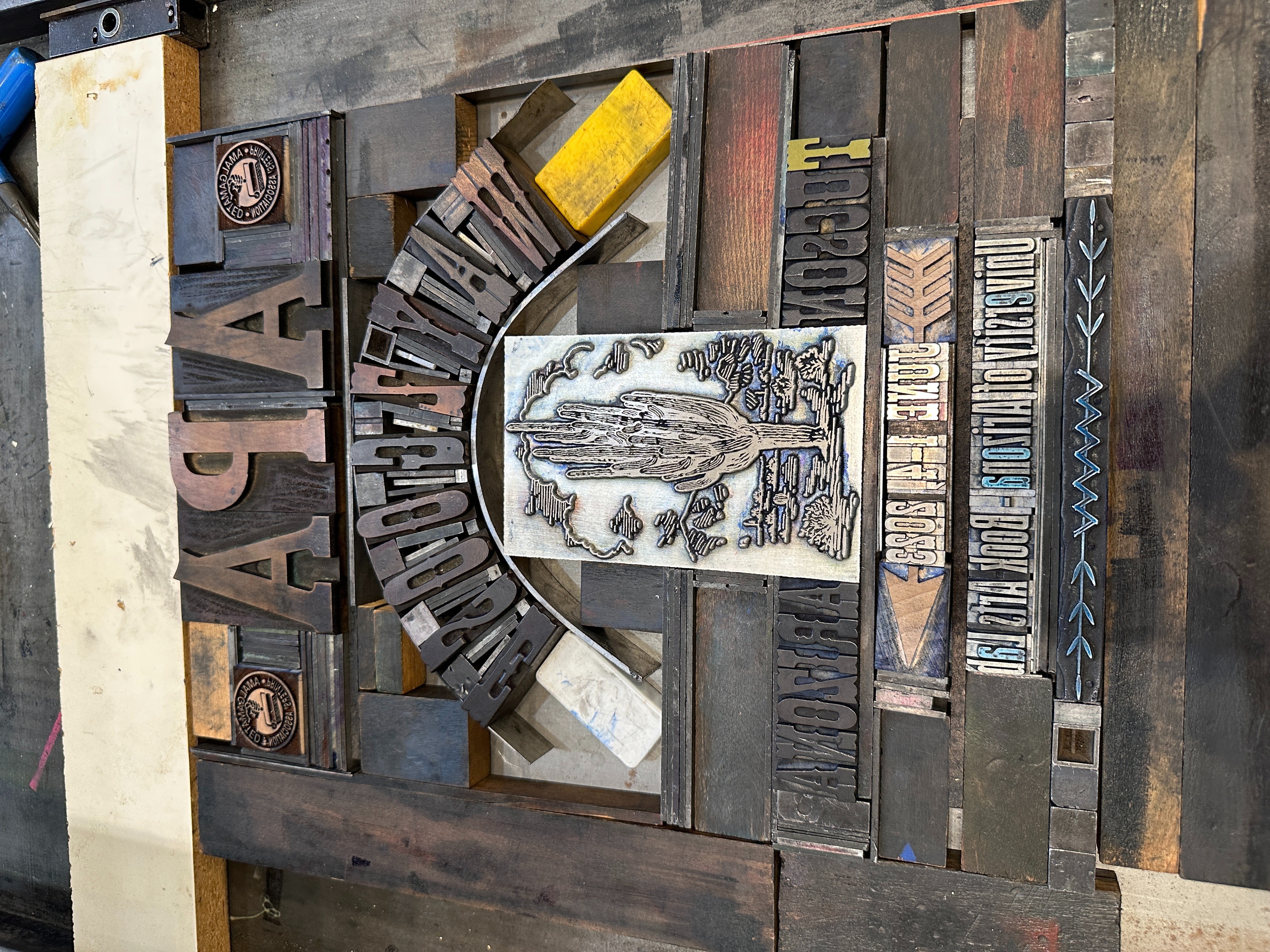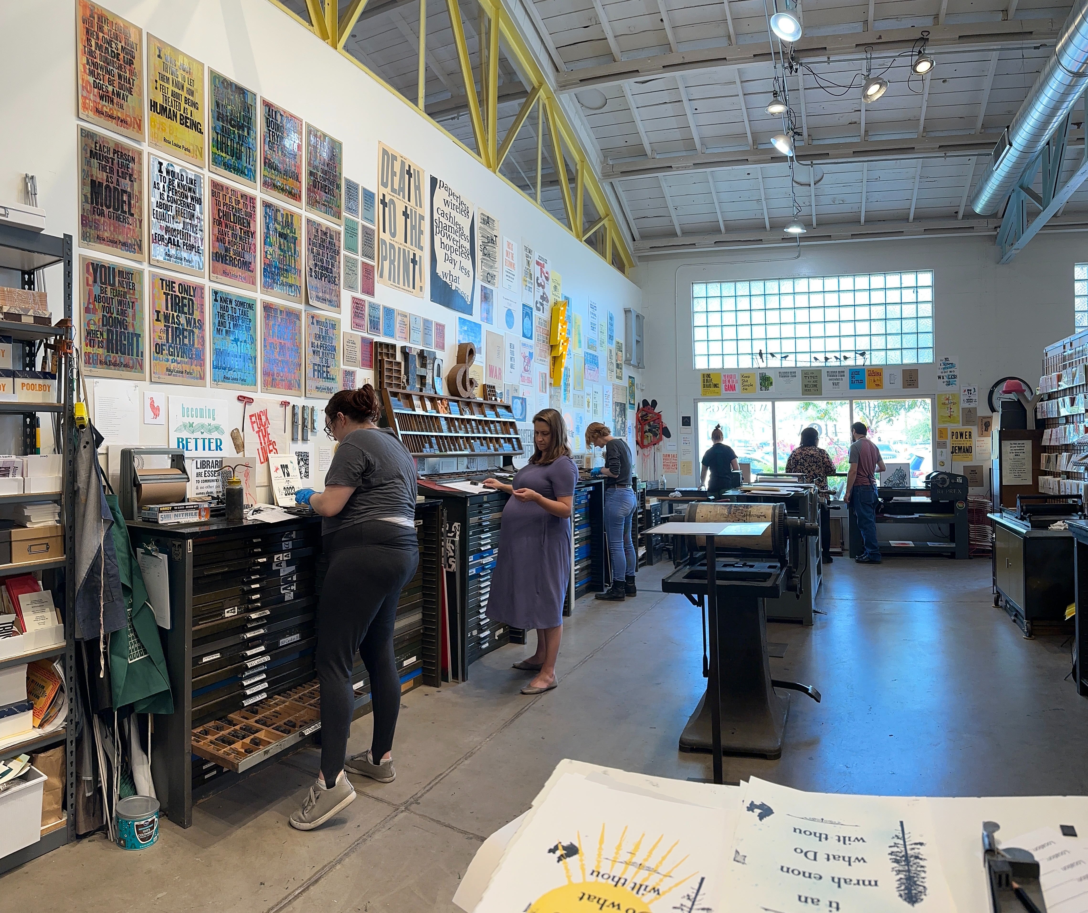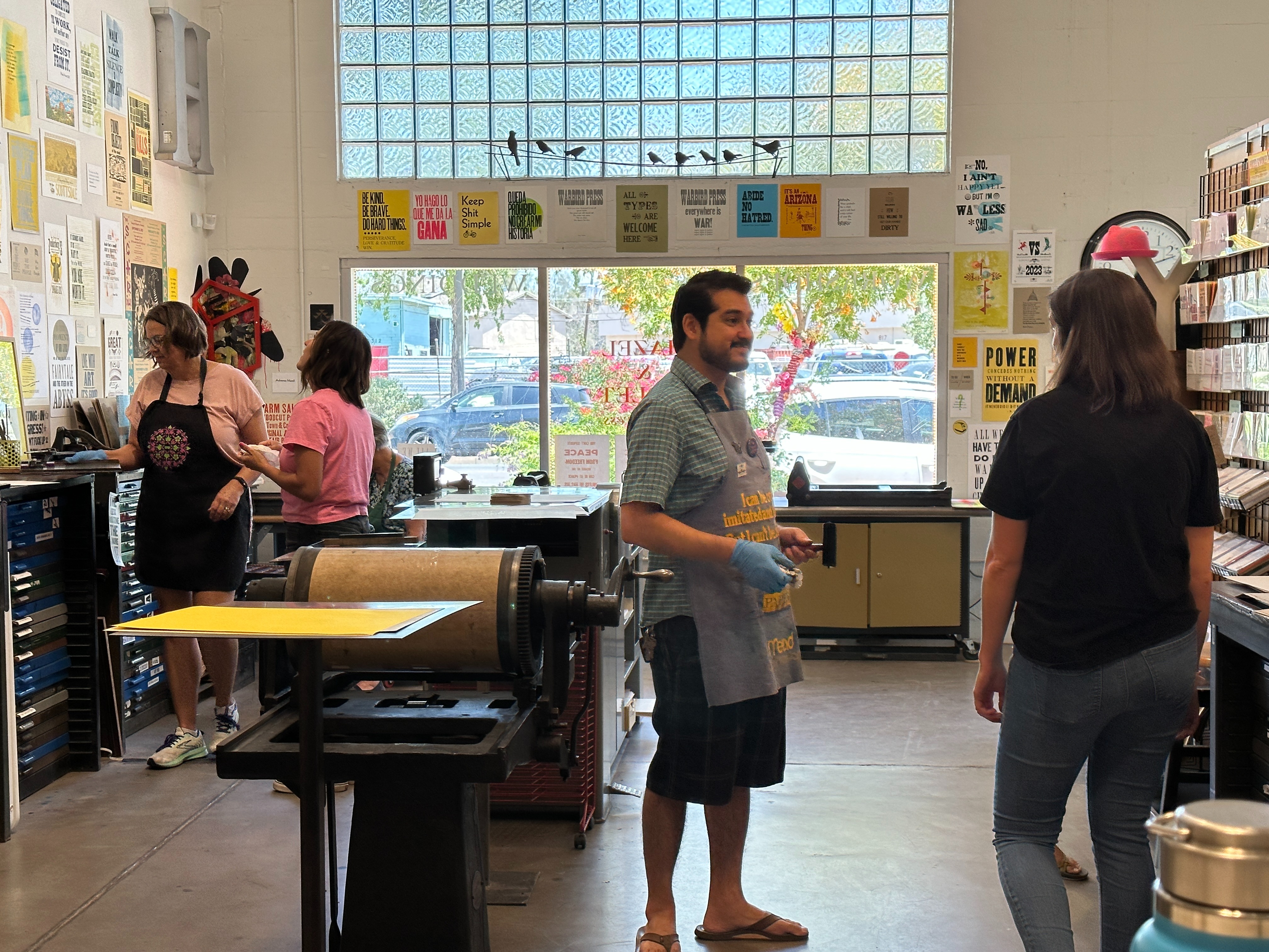 We are an open-to-the-public letterpress studio, community resource, teaching facility, unique venue rental, and commercial print shop on Historic Grand Avenue in downtown Phoenix, Arizona. We print custom wedding invitations, stationery, business cards and stationery, coasters, and broadsides. We have a retail line of cards, stationery, calendars, coasters, and art prints. We are a venue for letterpress workshops (Eventbrite), event rentals and presstime rentals. We are generally open from 12-4 Tuesday – Saturday and 5 - 9 pm Third and First Fridays, A quick text or call will let you know if we have stepped out.